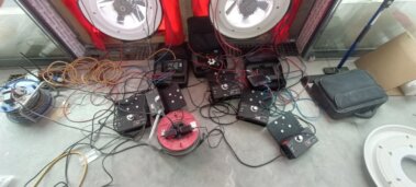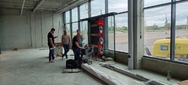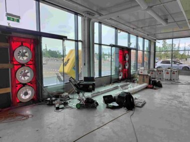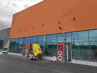 Beauftragt mit der Messung war unser Team von Burian & Kram Bauphysik – im Auftrag der HT Generalunternehmer & Industriebau GmbH, die das Gesamtprojekt umsetzt. Aufgrund des riesigen Gebäudevolumens von über 82.000 m³ kamen gleich acht Blower-Door-Systeme parallel zum Einsatz.